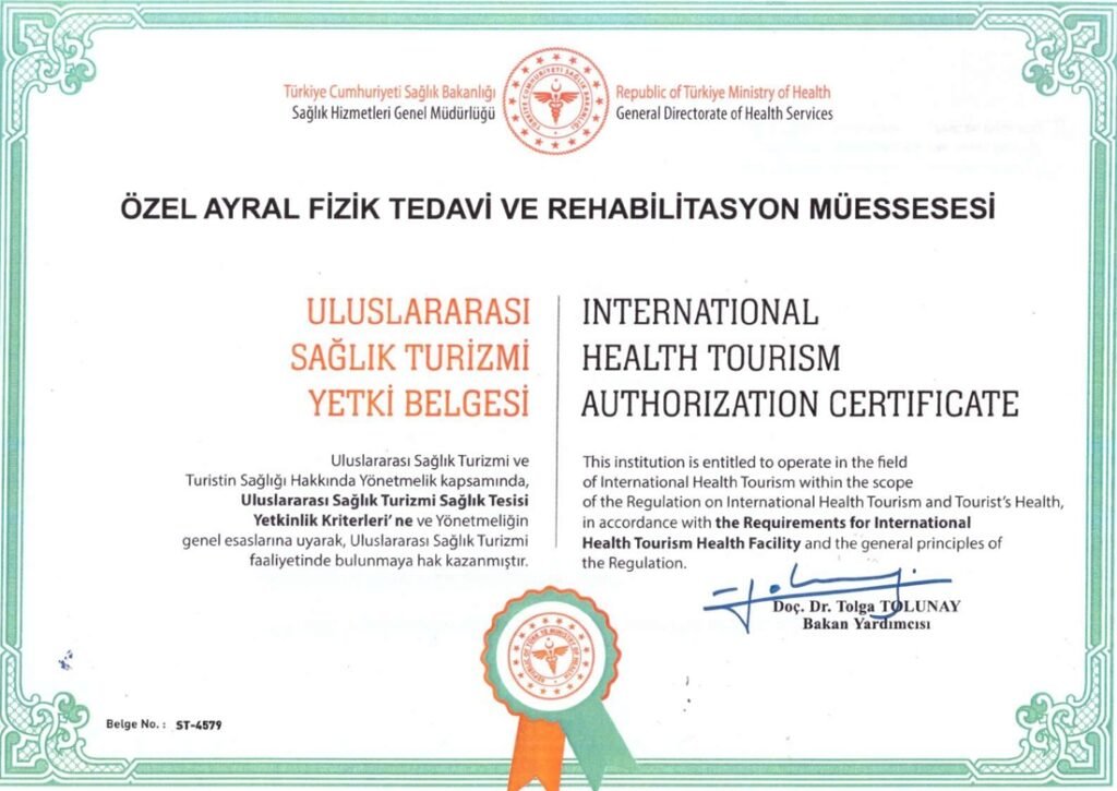 Tesisimiz, Uluslararası Sağlık Turizmi ve Turistin Sağlığı Hakkında Yönetmelik kapsamında, Uluslararası Sağlık Turizmi Sağlık Tesisi Yetkinlik Kriterleri’ne ve Yönetmeliğin genel esaslarına uyarak, Uluslararası Sağlık Turizmi faaliyetinde bulunmaya hak kazanmıştır.